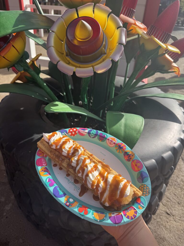 We’re pretty sure this counts as a full serving of vegetables—because Disney vegetables are built differently (disclaimer: we are not doctors, so maybe take that advice with a grain of salt). Our group loves carrot cake, and this churro absolutely delivered.